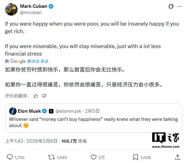 身价超 8000 亿美元的世界首富马斯克本周四在 X 上发帖,称“‘金钱买不到幸福’这句话说得真是太对了”,遂引发大量关注与讨论。目前这条帖子的浏览量已超过 1 亿次。