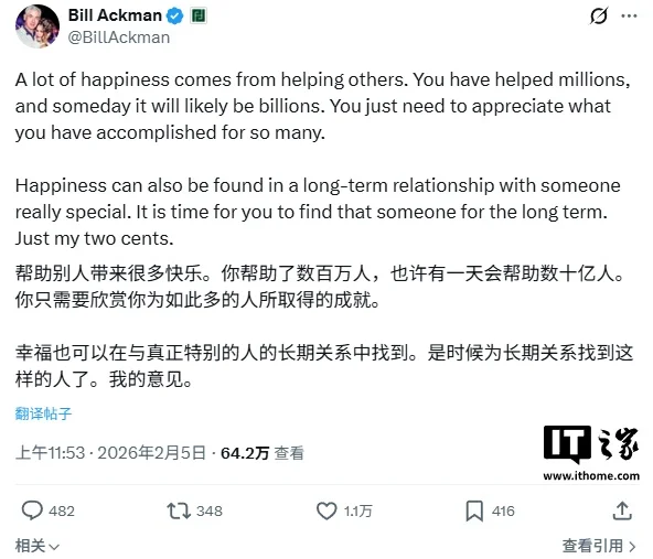 这一言论在 X 上引发了广泛的反响,其中包括一些曾面临同样困境的超级富豪。对冲基金亿万富翁比尔 · 阿克曼表示,“很多幸福都源于帮助他人。你已经帮助了数百万人,未来很可能会达到数十亿人。你只需要珍惜你为这么多人所取得的成就就好。”阿克曼还表示,或许马斯克该找一位长期伴侣安定下来,“幸福也可能源于与某个特别之人所建立的长久关系。是时候去寻觅那个能与你长久相伴的人了。这只是我的一点小小的建议。”