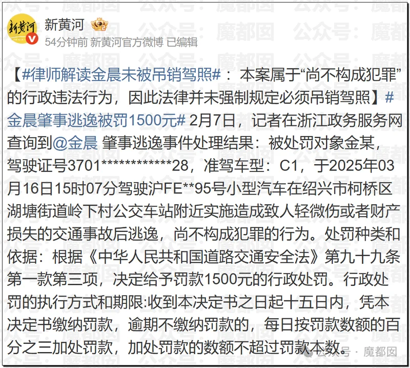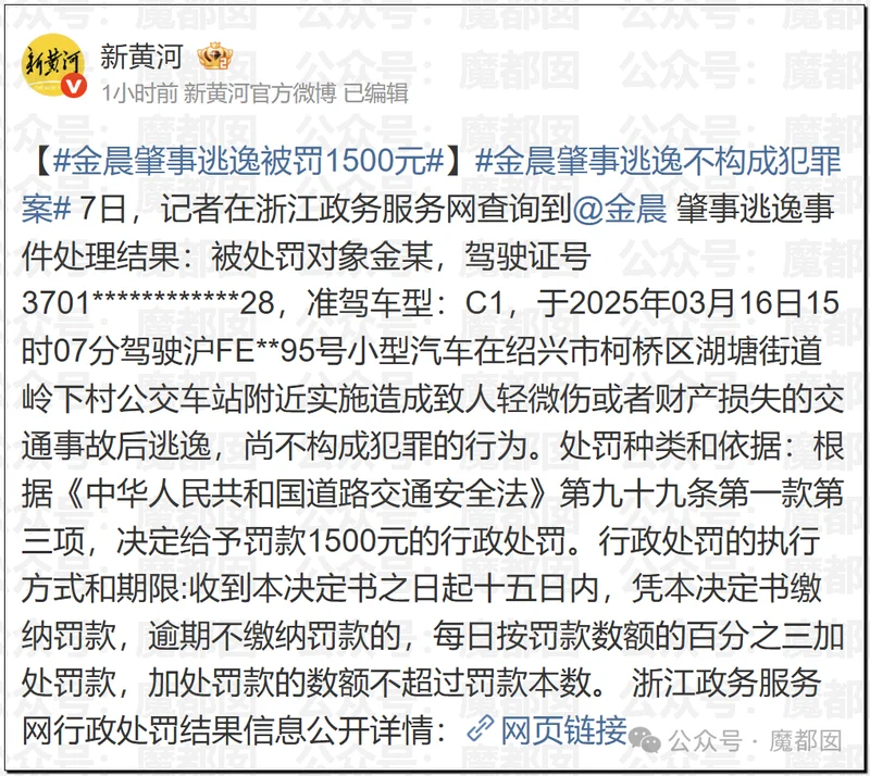 据新京报报道,女星金晨交通肇事逃逸事件有了新进展。浙江政务服务网显示,1月30日,绍兴柯桥交警对该事件作出行政处罚,决定给予金晨罚款1500元,并判定其不构成犯罪。从警情通报看,所公布的内容与之前金晨本人的微博发文大致相同。可以得到确认的事实是,当时车祸发生后,受伤的金晨离开了现场。这一行为被定性为行政违法,而不构成犯罪,意味着金晨只需要承担罚款的行政处罚,不用担心被追究刑事责任。