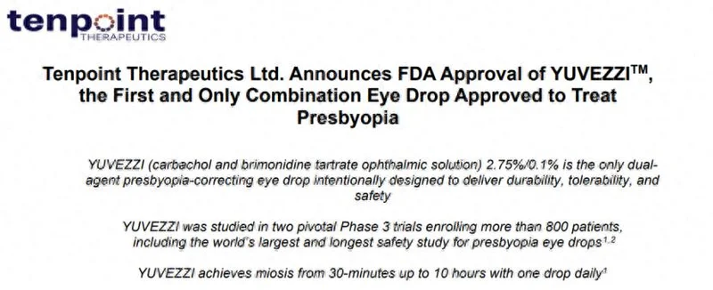 “FDA 批准 Yuvezzi 上市,对于美国数百万饱受老花眼困扰、每天都面临诸多烦恼和挑战的人来说,无疑是一个重要的里程碑,”Tenpoint Therapeutics 的 CEO 亨利克·比约克(Henric Bjarke)对媒体表示,“作为首个获得 FDA 批准的用于治疗老花眼的双效滴眼液,Yuvezzi 利用卡巴胆碱和酒石酸溴莫尼定的作用机制,在保证良好耐受性的同时,显著改善近视力。人们需要的不仅是有效的治疗方案,更是能够便捷地融入日常生活的治疗方案。”