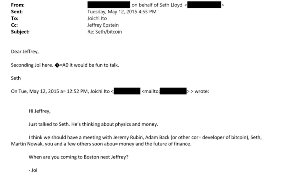 伊藤穰一在2015年的一封电邮中写道:“我们应该尽快与鲁宾(Jeremy Rubin)、巴克(或其他比特币核心开发者)、劳埃德(Seth Lloyd)、诺瓦克(Martin Nowak)、你和其他一些人开会,讨论货币和金融的未来。”