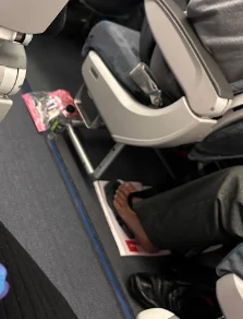 画面中,这名乘客为了避免双脚直接接触机舱地板,先将免税品杂志摊开铺地,再把脱下来的“原味袜子”垫在杂志上,双脚就这样踩着休息。网友当场被吓到,忍不住提醒大家:“搭飞机时尽量不要随手拿免税杂志来看,因为你永远不知道上一位乘客拿它来做什么。”
