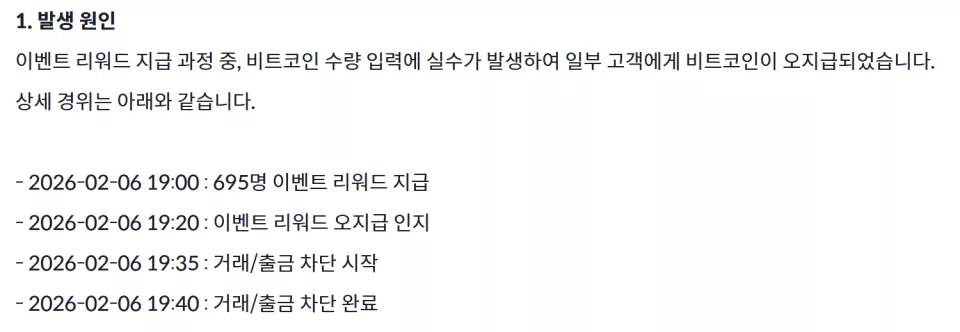 Bithumb事后发布的复盘公告显示,活动开始后经过20分钟发现“发的是比特币”,然后又花了15分钟启动阻止相关账户交易/提币的程序,到19点40分完成突发情况的处置。
