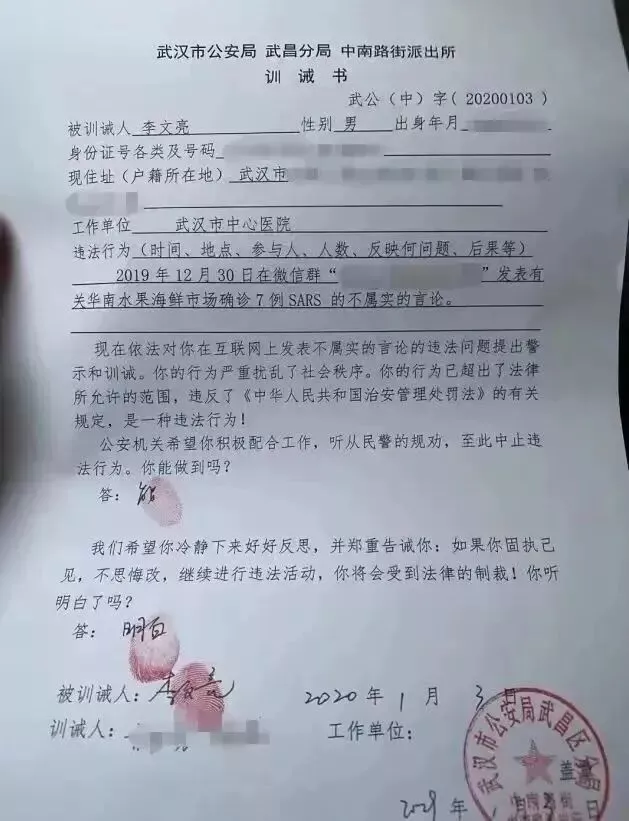 2020年1月3日,李文亮因“在互联网发表不属实的言论”,被警方警示及训诫。1月3日,武汉市公安局武昌分局下属派出所联系李文亮。民警谈话警示,并为李文亮制作了训诫书。训诫书告诫李文亮“如果你不思悔改,继续进行违法活动,你将受到法律的制裁”。李文亮签署承认“在微信群发布有关华南水果海鲜市场确诊”等信息为“不属实的言论”。