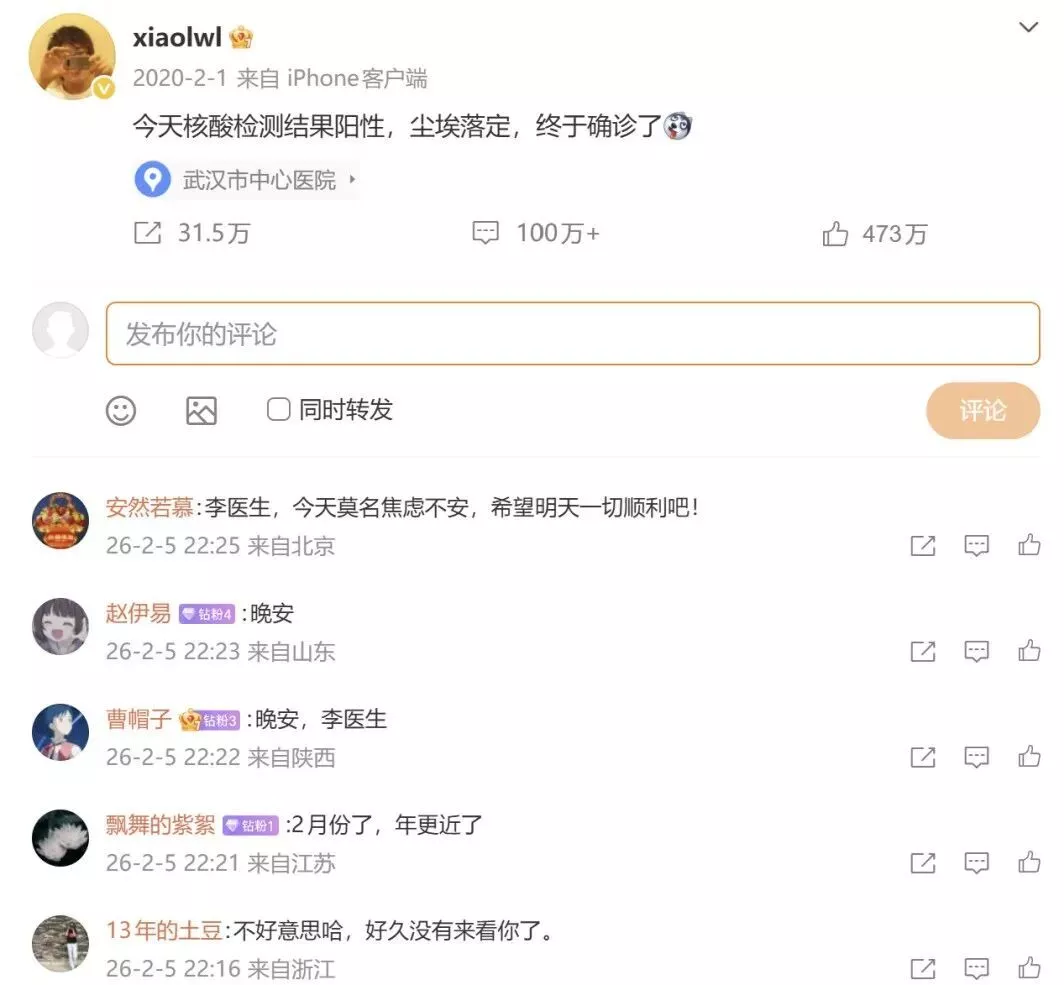 1月31日,李文亮医生确诊感染新冠病毒。2月1日上午10时,李文亮在自己微博上公布了他确诊新冠的消息。