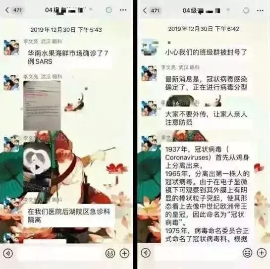 2019年12月30日,李文亮医生收到同事发来的相关病例。那天17时,他以“李文亮武汉眼科”的群昵称,在武汉大学临床04级同学微信群中转发了“华南水果海鲜市场确诊了7例SARS”、“在我们医院后湖区急诊科隔离”等信息,同时附上一张标有“SARS冠状病毒检出阳性”的临床病原体筛查结果图片,以及一段肺部CT视频。另一位群友马上回复“小心我们的班级群被封号了”。