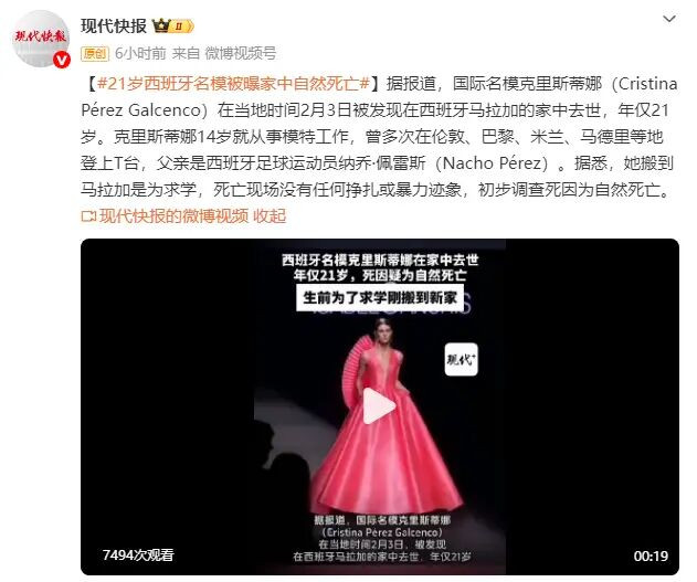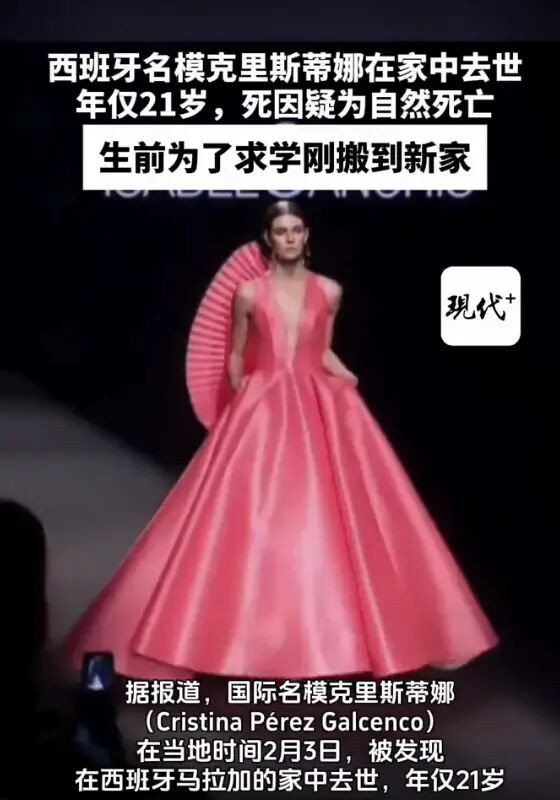 据报道,国际名模克里斯蒂娜(Cristina Pérez Galcenco)在当地时间2月3日被发现在西班牙马拉加的家中去世,年仅21岁。 克里斯蒂娜14岁就从事模特工作,曾多次在伦敦、巴黎、米兰、马德里等地登上T台,父亲是西班牙足球运动员纳乔・佩雷斯(Nacho Pérez)。 据悉,她搬到马拉加是为求学,死亡现场没有任何挣扎或暴力迹象,初步调查死因为自然死亡。