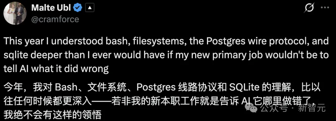 Vercel CTO Malte Ubl更是形象地描述了他当下的工作状态:「我不再写代码,我的主要工作就是告诉AI它哪里做错了。」