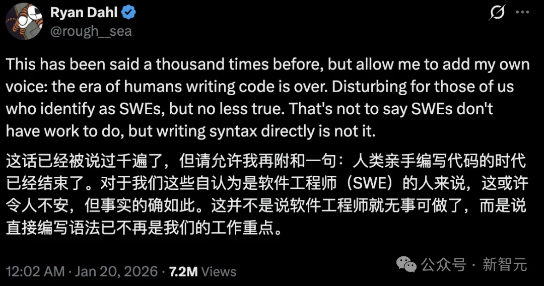 NodeJS之父Ryan Dahl直言「人类写代码的时代已经结束」,软件工程师的重心将彻底转移;