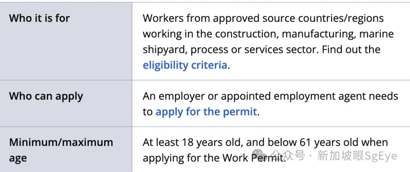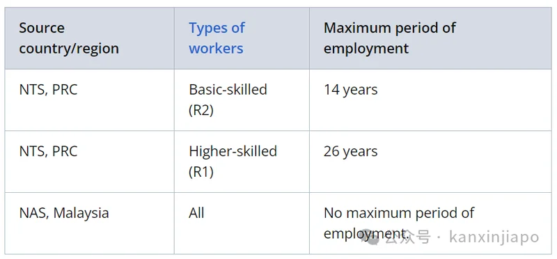 比如此前建筑业、海洋造船厂业和加工业的WP持有者(中国籍和非传统来源地)根据所属的行业、所属行业和工人的技能等级(R1、R2)的不同:在新加坡逗留的最长期限分别为14年和26年。而马来西亚、韩国、香港特区、澳门特区和中国台湾的WP持有者则没有年限限制。