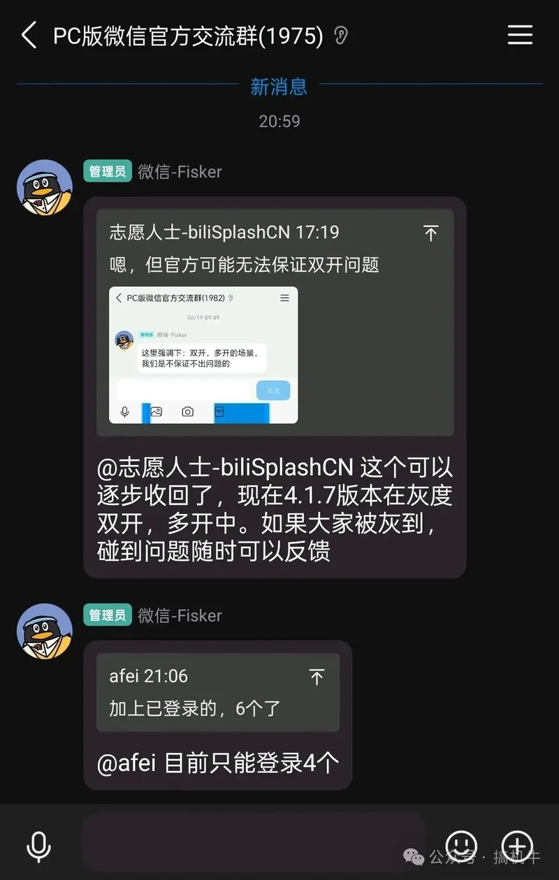 根据PC版微信官方交流群中反馈的消息来看,在最新的PC版微信4.1.7版本开启了双开、多开的功能,可以同时登录4个微信。