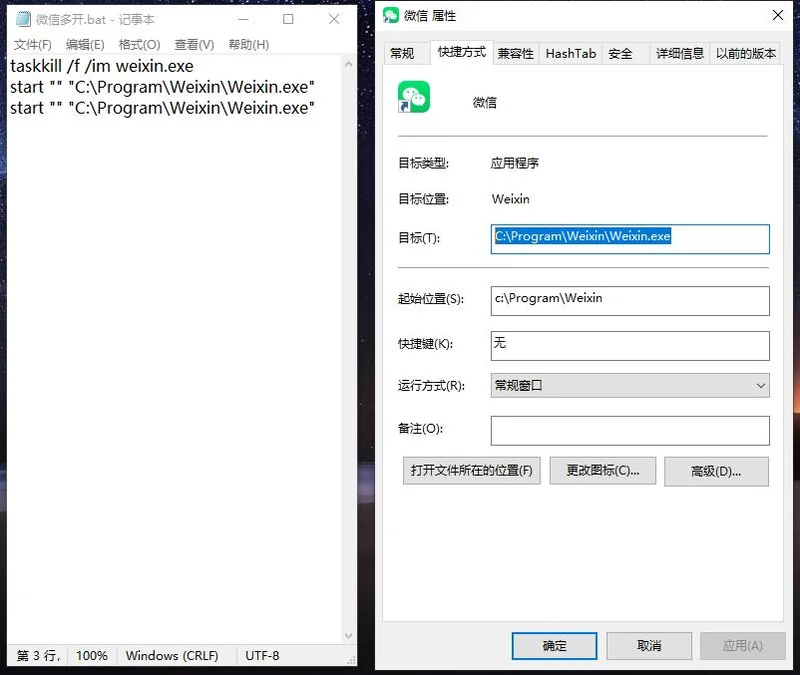 另外,上面的微信路径要根据自己的实际情况进行编辑,把“C:\Program\Weixin\Weixin.exe”换成你的微信安装目录,然后保存文件。