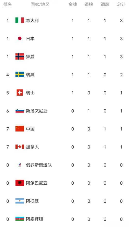 米兰冬奥首日奖牌榜,中加并列第七一点资讯