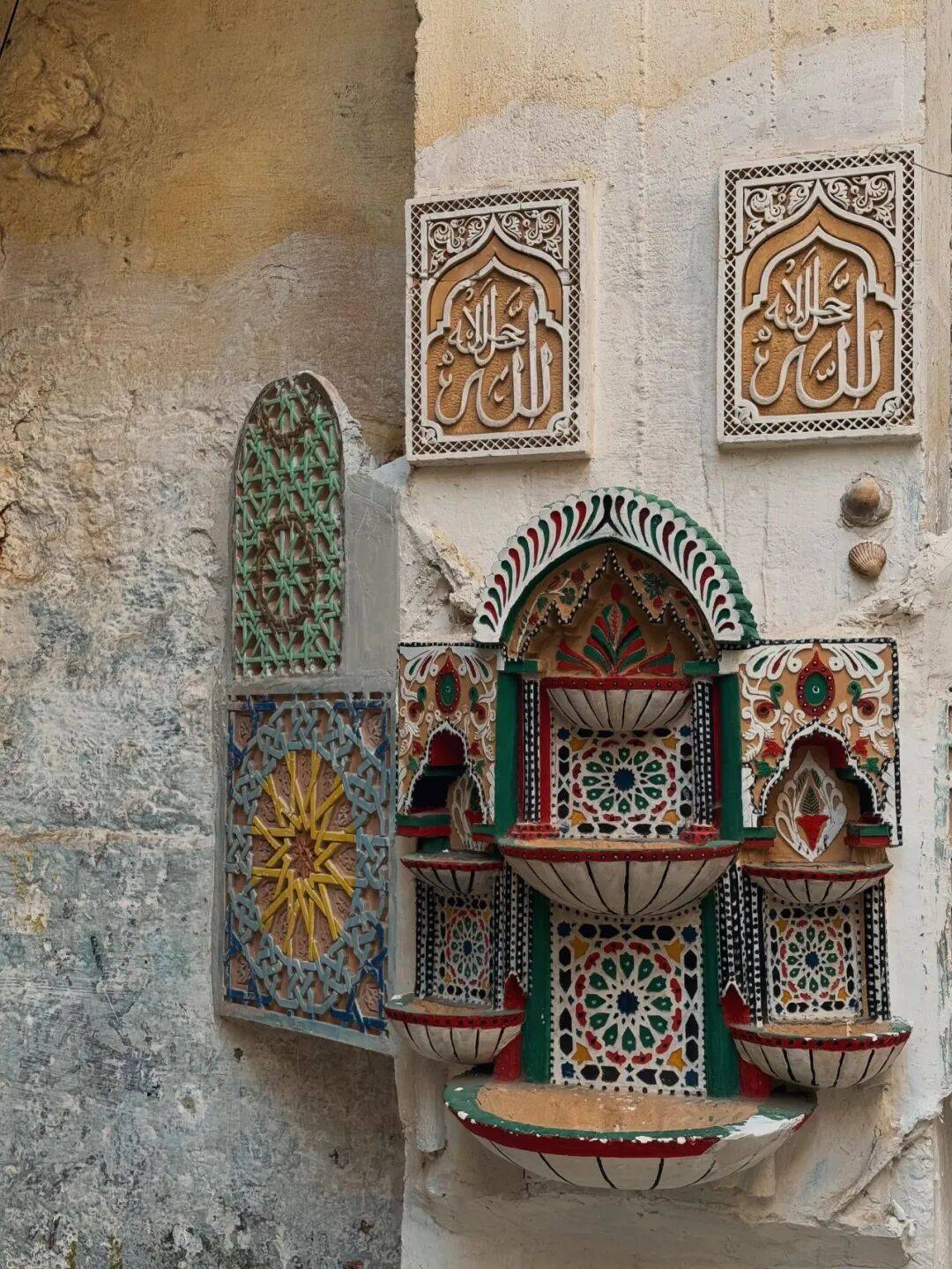 第二个就是石膏雕塑,墙上面雕刻着复杂的几何图形、阿拉伯文字以及植物图案,反正没有一处是留白的。