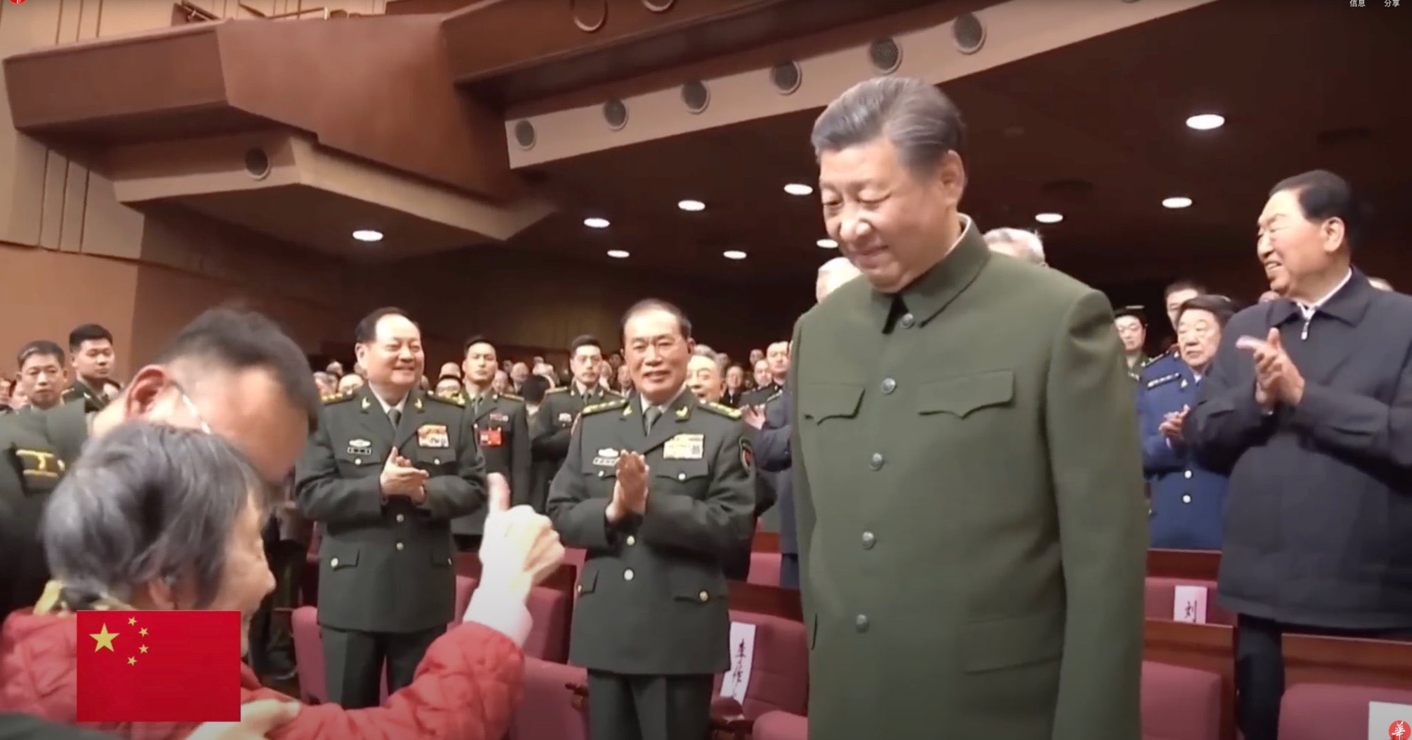 虽然观看演出的都是中共的老军头,但中共党魁习近平对他们也是不敢放松警惕。从央视播出的现场画面中,可以看到穿军装的彪形大汉直接站在这些退休的老干部当中,而且十分显眼,虽然他们也和老人们一起鼓掌,但这些年轻人不但表情紧绷,眼神不停地扫视着整个现场,而且还戴着耳机,可能是在随时接收指令,即使习近平面对的是一群老人家,但整个现场给人的感觉是“如临大敌”。