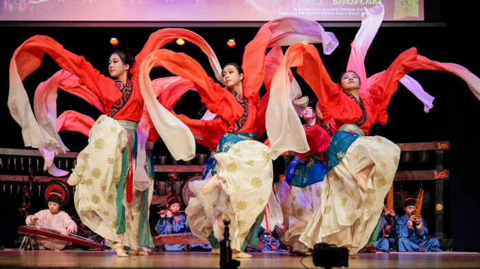 此次在美东双城呈现的九个精彩节目,同样是多元文化对话的生动体现:《朝乐-文舞》重现秦代宗庙仪礼,《望月婆罗门》融汇敦煌壁画舞姿与西域舞韵,《楚商》奏响浪漫、神秘的先秦楚地清商调,《龙腾虎跃》结合当代民族打击乐曲与中国古典舞……一台演出,窥见悠久中华文化的万千气象。