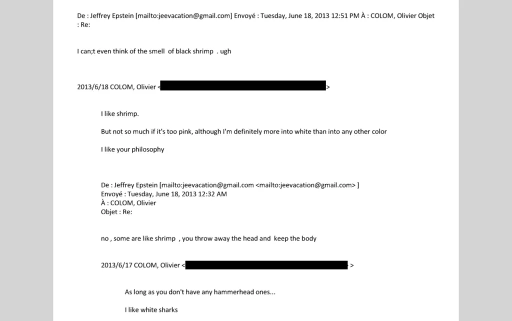 随后,又有网友发掘出编号EFTA01758926的艾泼斯坦与法国暨欧盟资深外交顾问科隆姆(Olivier Colom)的电子邮件。 迪拜风险投资公司(IBC Group)创办人兼执行长纳法(Mario Nawfal)从电子邮件前后文判断,信件中的2名俄罗斯女孩跟儿童分别暗喻成“白色鲨鱼”、“虾子”,艾泼斯坦向提出建议:“有些跟虾子差不多,你会把头去掉只吃身体”。