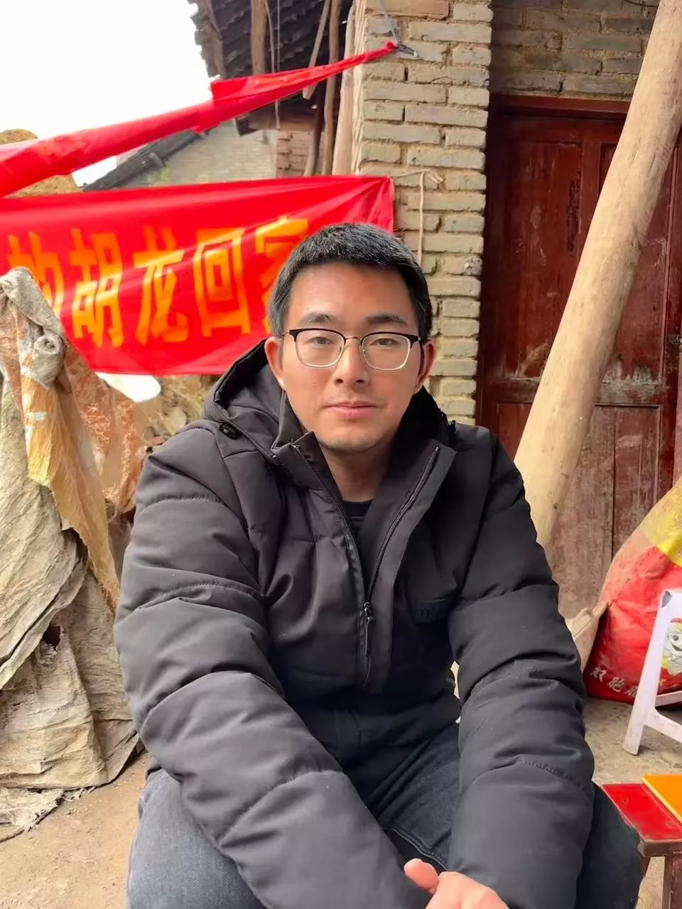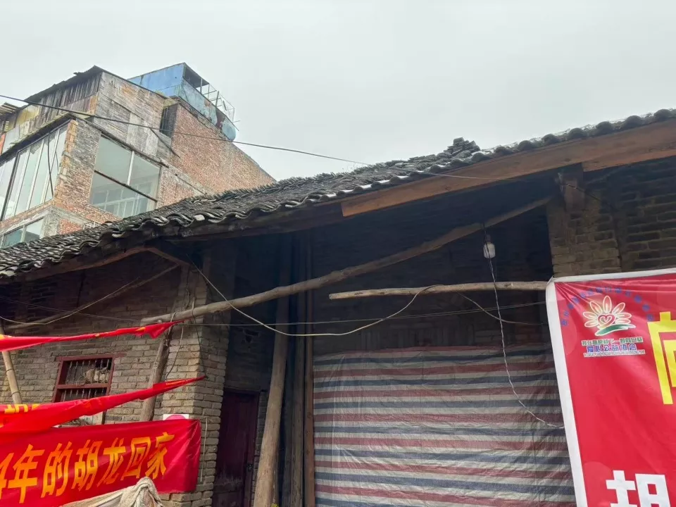这是一栋老旧的砖瓦平房,砖墙被烟火熏得变了色,院前是一片未经硬化的泥土地,院内仍保留着“胡龙回家”的红色横幅与展板,鲜艳的颜色为这个老屋增添了一丝喜庆。