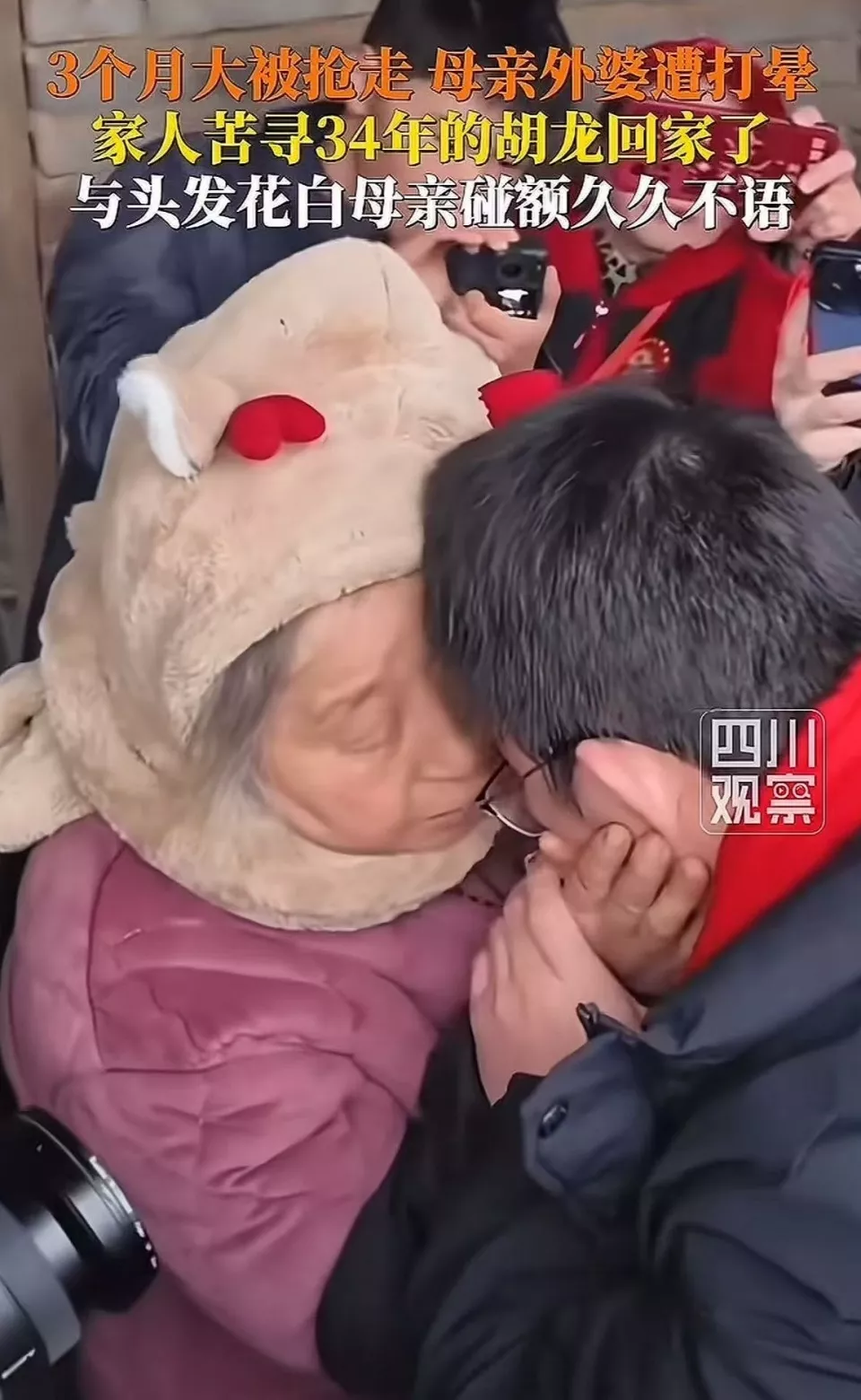 认亲现场,相拥的母子未过多言语,他们额头相抵,胡龙抚上母亲沟壑纵横的面容,抹去她眼角泪水。取下帽子时,看着母亲银白稀疏的头发,胡龙内心泛起酸涩。