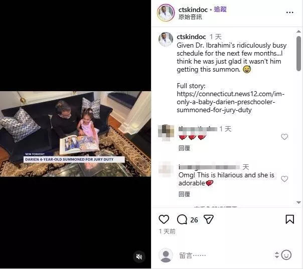 美国康乃狄克州、年仅4岁的扎拉收到陪审通知信。(图撷取自@ctskindoc社群平台Instagram”)
