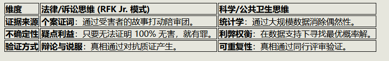 这种思维在法庭上是斗志,但在公共卫生决策中却是风险:它将“概率科学”变成了一场永无止境的“法庭辩论”。