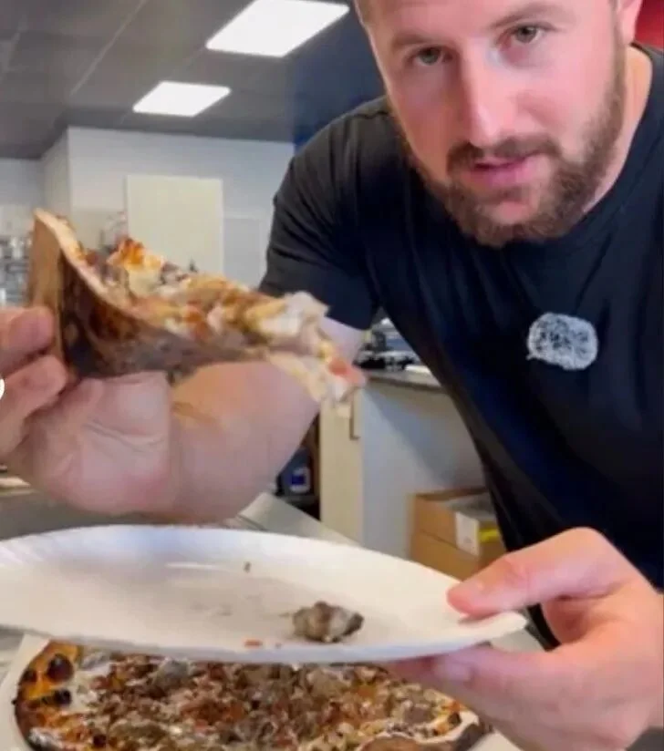 披萨烤好后,Izquierdo一边大口品尝,一边感叹: