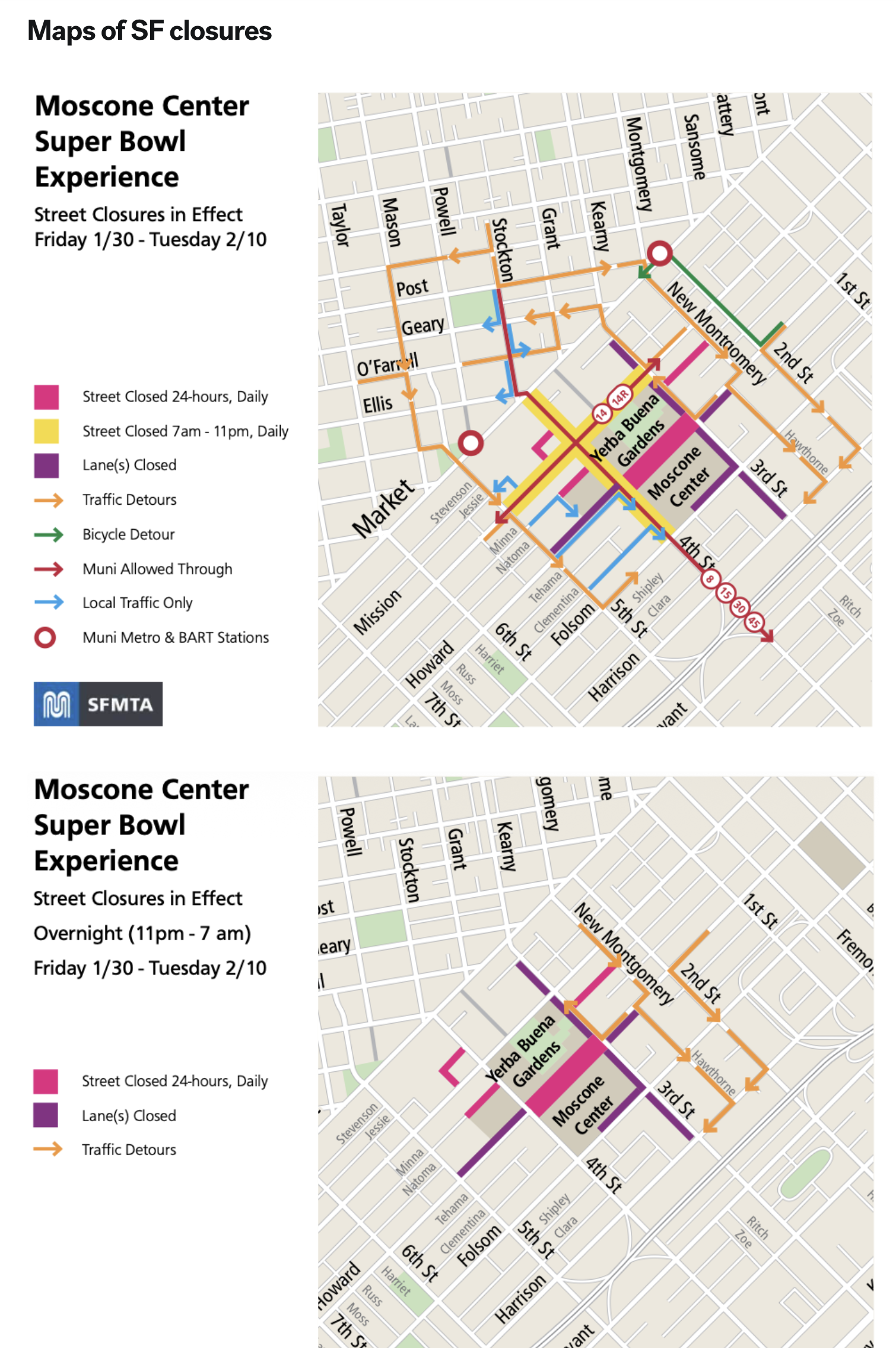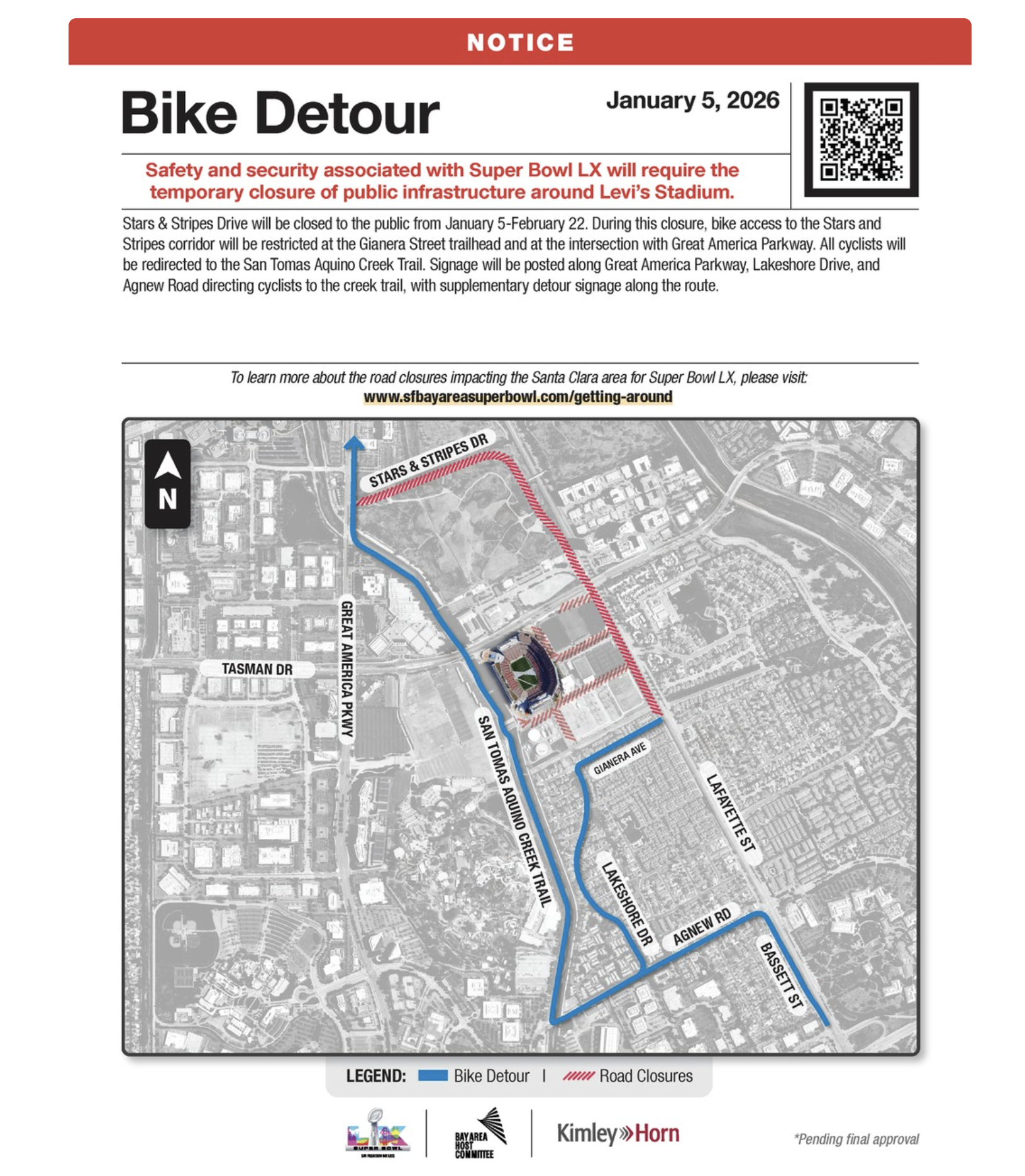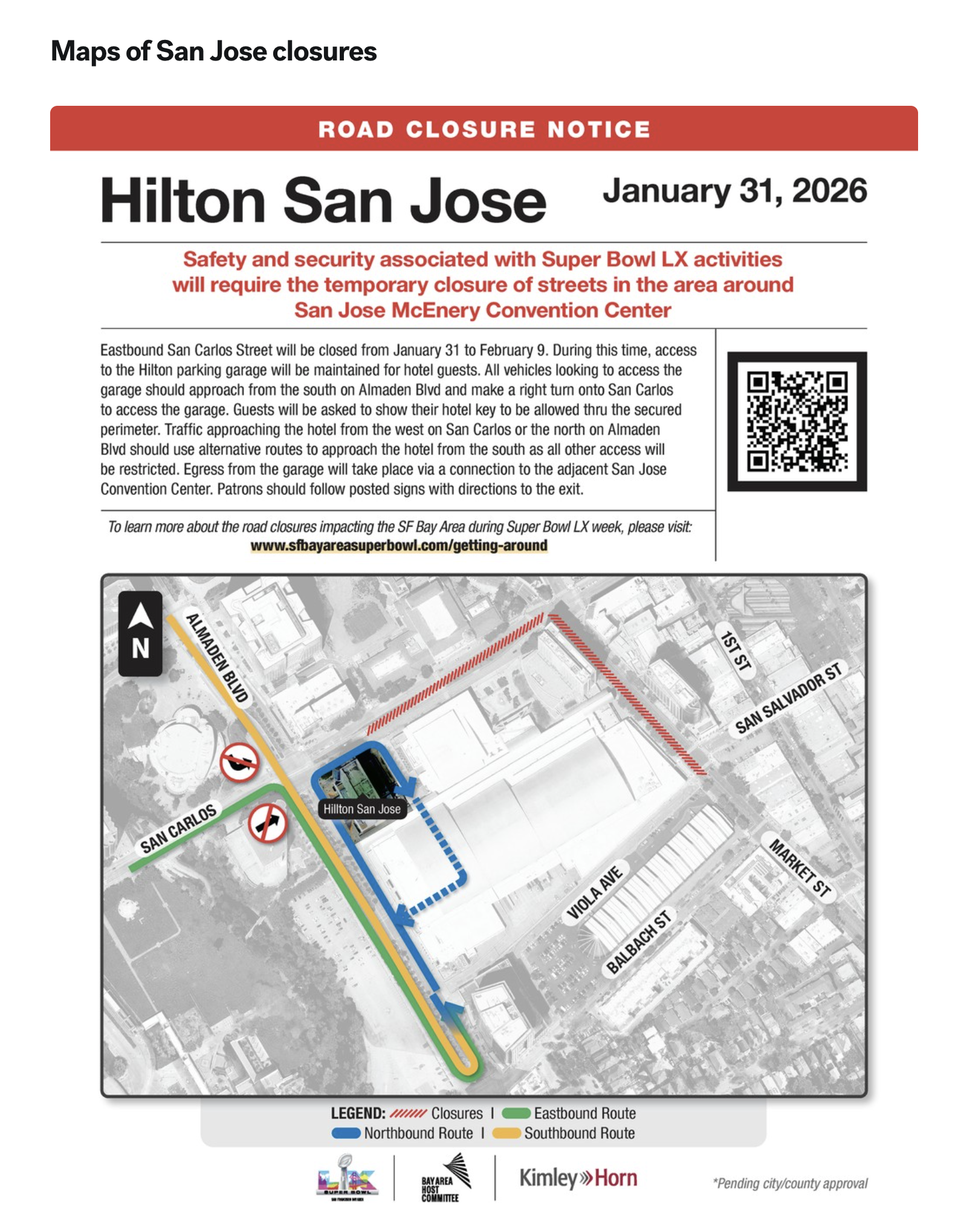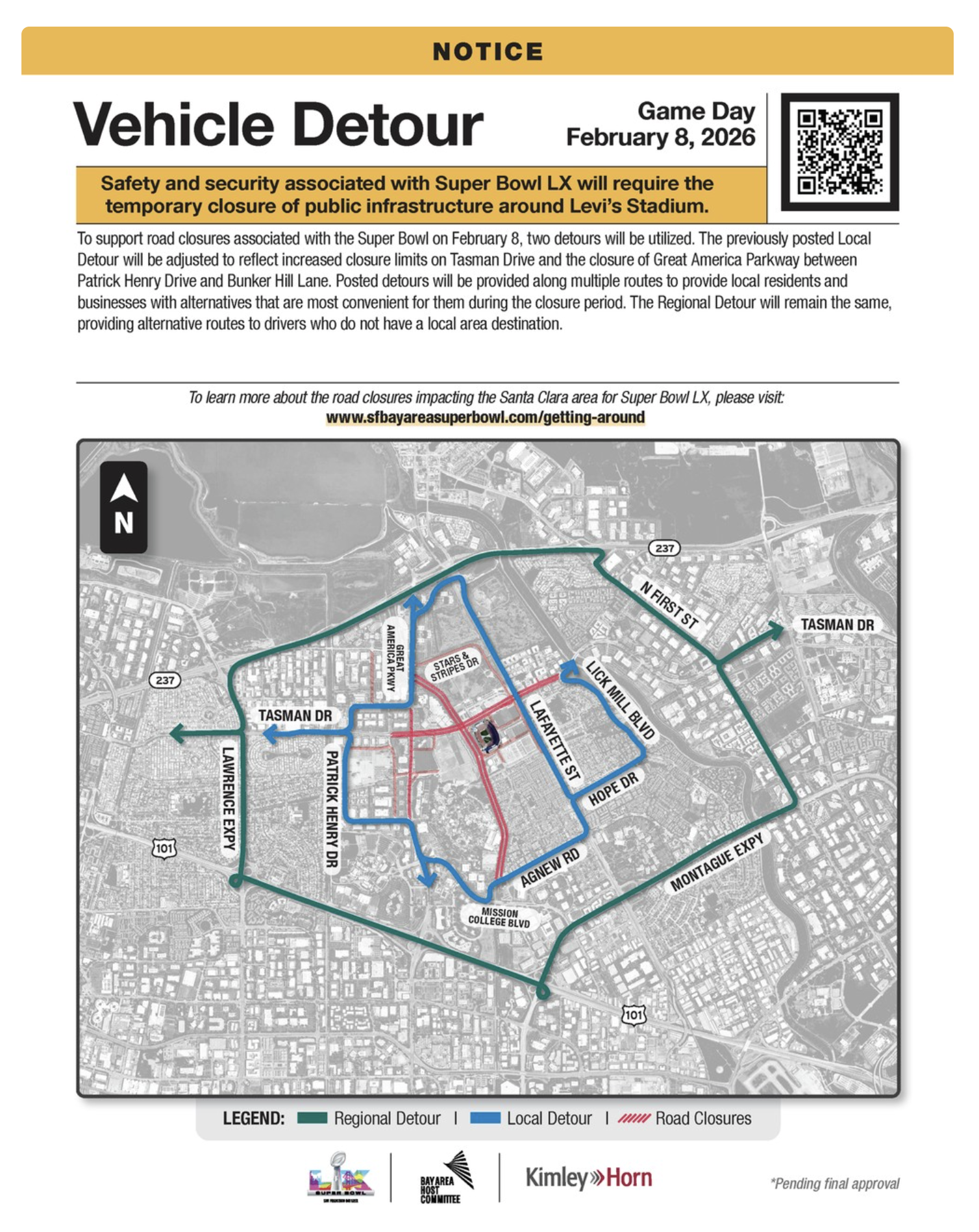 在圣克拉拉,靠近Levi’s Stadium的Tasman Drive(从Calle Del Sol到Great America Parkway)与Stars and Stripes Drive将长时间封闭,甚至超级碗当天部分路段进一步加强限制。湾区其他城市旧金山的Howard Street、Bay Street、Taylor Street等多条道路也将在不同时间段陆续封闭或交通受限。