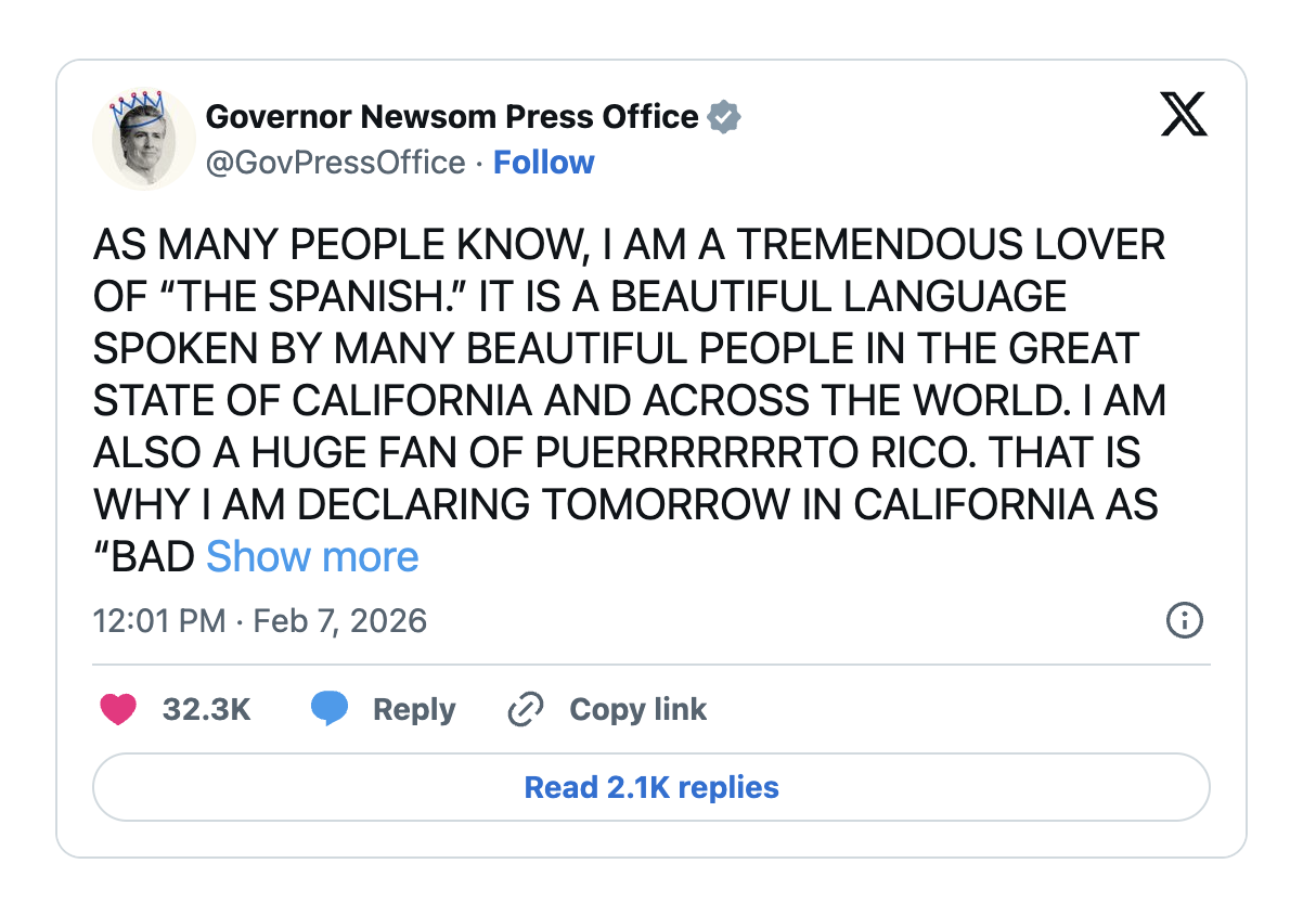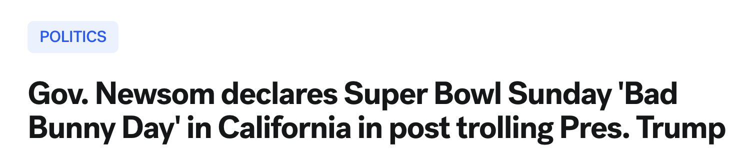 加州州长加文·纽森(Gavin Newsom)更在社交平台上宣布2月8日为“Bad Bunny Day”,庆祝这位艺人在超级碗中场秀上的亮相,并用幽默风格调侃不来参加比赛的川普总统:“这是加州的盛大日子!”纽森在帖文中写道:“…这是为什么我宣布明天为’Bad Bunny Day’,因为他将以他那美妙的声音和魅力带来一场大表演。”