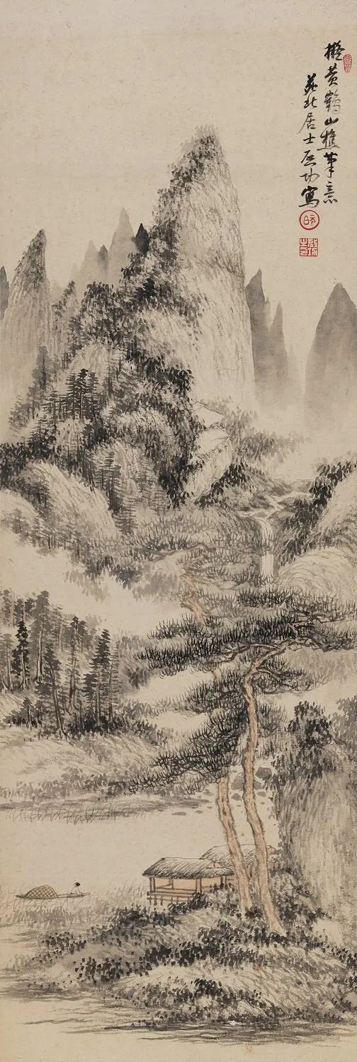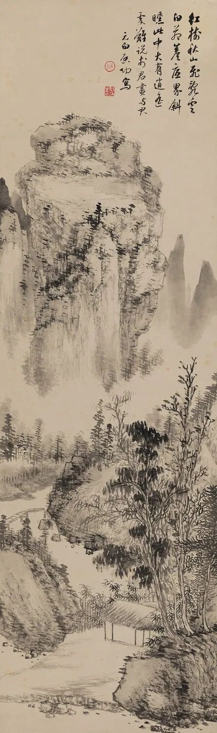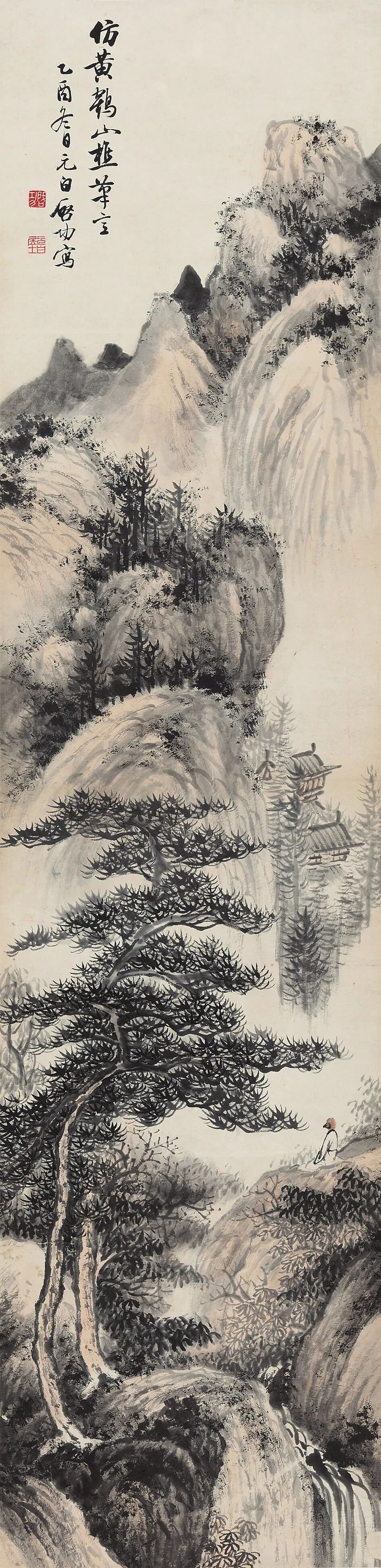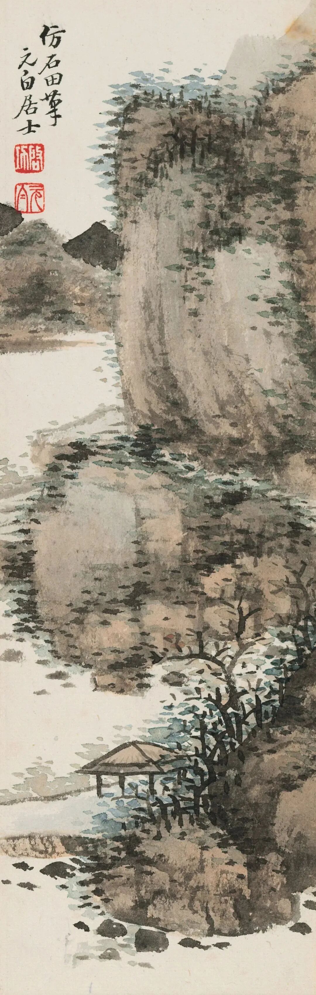 拟古仿古是启功先生绘画创作的一个重要内容。在启功存世的山水画中有许多这类作品,如“拟元人笔意”,“拟元人小景”,“拟黄鹤山樵笔意”,“仿石涛”,“仿蓝瑛”,“元白法古山水册”等等。
