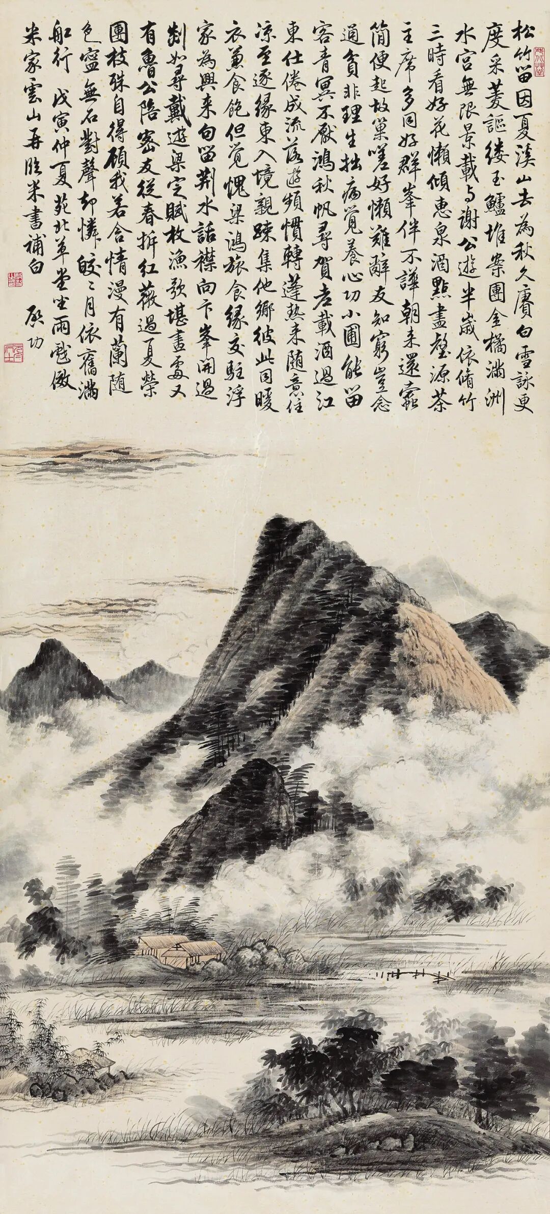 他的山水画主要也是取法的南方画派一路画法,尤其是他的老师吴镜汀就是从王翚入手,涉猎宋元明清诸家,山水画作多细笔设色,清新雅致。启功在他二位文人画家老师的教导下不仅提高画艺,在文史、书法、诗词、鉴定等各方面受益良多。他的山水画传统功夫深厚,北人南画,在画境文心的南宗山水画风貌中又透露出一股刚健清新之气。