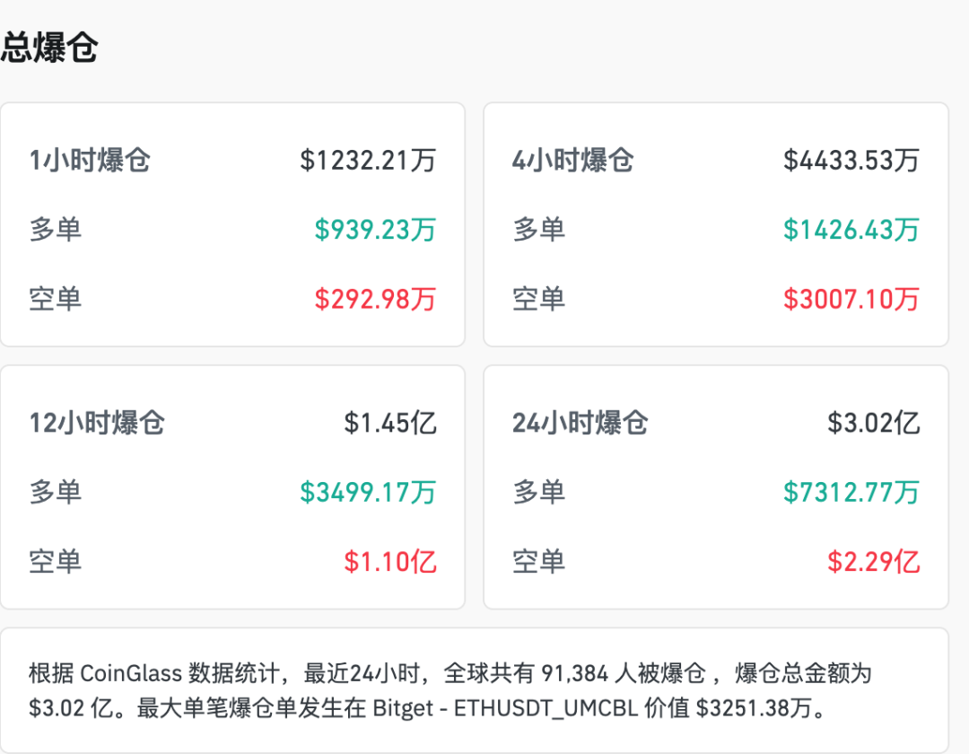 CoinGlass数据显示,最近24小时,加密货币市场共有超9.14万人爆仓,爆仓总金额超3亿美元。