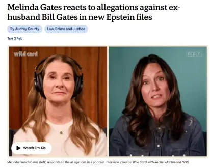 就在网友将信将疑之际,比尔.盖茨的前妻梅琳达几乎同时在一档播客节目中首次就爱泼斯坦文件公开发声。她表示,当看到文件涉及比尔.盖茨时,心中充满“难以置信的悲伤”,勾起了过去婚姻中“非常痛苦的时刻”。梅琳达强调,爱泼斯坦及其网络对受害者造成的伤害“超越心碎”,并指出“这些细节应由实际涉及的人,包括我的前夫来回应,而不是我”。