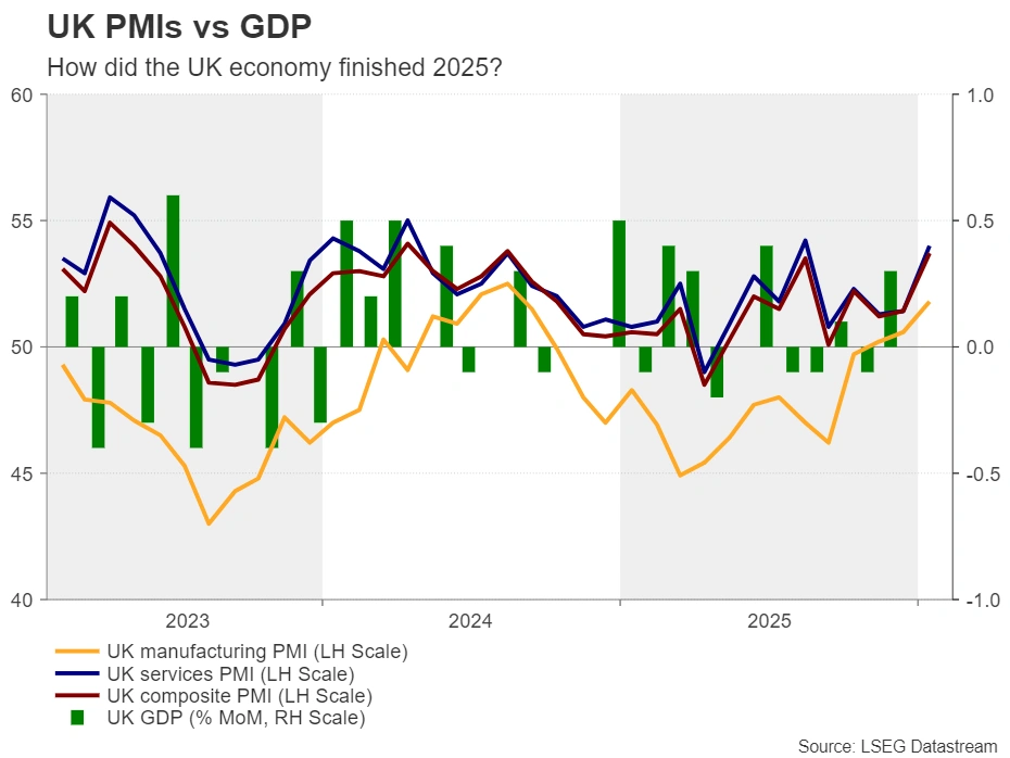 这促使投资者增加了降息押注,认为3月19日会议降息的概率接近50%。到今年年底,市场预期将有两次降息,与美联储一致。由于经济正在放缓且2025年第三季度增长乏力,若第四季度数据再度走软,将增加3月降息的概率并推低英镑。不过值得一提的是,最后三个月的PMI数据较第三季度有所改善,且1月PMI的进一步上升指向了新一年更健康的开局,这令数据超预期的风险偏向上行。