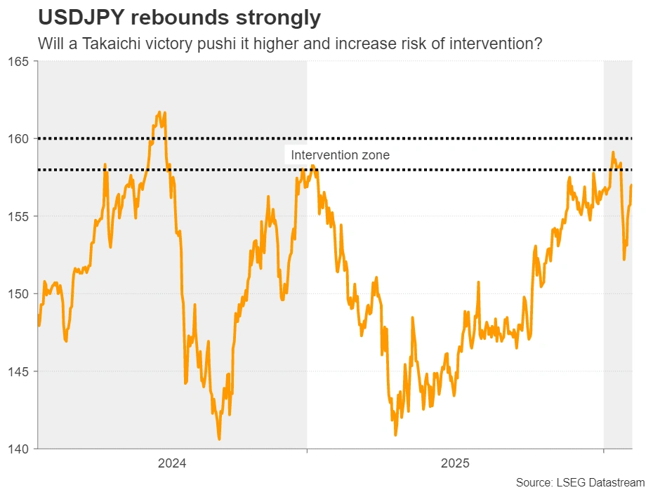 因此,如果现任联盟确认获得压倒性胜利,市场对大规模支出及向日本央行(BoJ)施压放缓加息的预期将升温,日元可能会回吐此前因干预预期带来的涨幅。也就是说,如果美元/日元再次逼近160.00区域,干预警告或新的汇率检查(Rate Checks)可能会出现,从而限制其进一步上涨。
