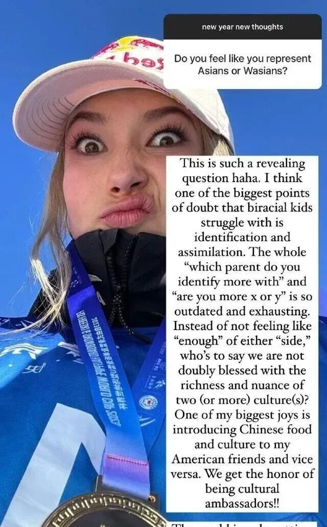 今年1月,她在接受《时代》杂志采访时再次确认,将继续代表中国参加米兰冬奥会,并且明确说,这个选择并不是因为经济原因。她说,美国已经有很多优秀运动员了,而她更想走一条属于自己的路。