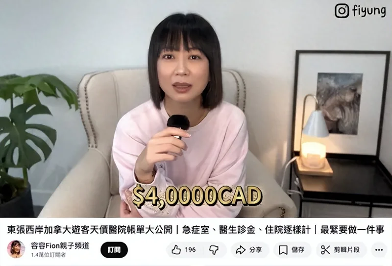 现年41岁的前TVB《东张西望》主持人容羡媛(Fion),前年合约期满离开TVB,结束了与TVB长达16年的合作关系,随后全家移民加拿大温哥华,转型成为KOL,喜欢在YouTube上拍摄视频分享加拿大生活。在容羡媛的最新视频中,她提到作为游客的母亲在加拿大住院,结账费用竟高达近23万港元!