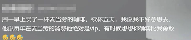 相较之下,麦当劳的咖啡续杯政策虽偶见老年人等候,但整体影响有限,且延续至今。曾有网友发布视频,羡慕友人周一购一杯麦当劳咖啡后连续五天免费续杯,称其“比我勇敢”。
