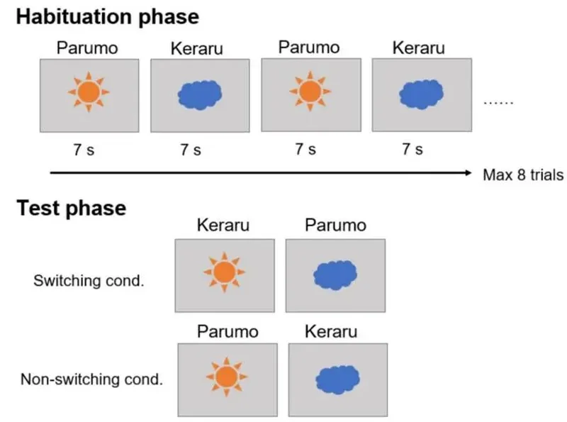 对猫猫的测试分为两个阶段。第一个阶段是习惯阶段,研究者给猫猫呈现太阳的图像,并同时电脑播报一串无意义的语音Parumo,给猫猫呈现画面和语音的组合;7秒后,切换乌云的图像,并播报另一端无意义的语音Keraru。如此循环太阳和乌云的图像及其对应的语音组合,直到每只猫都习惯了(猫猫的对屏幕切换的注意时间降低到最初的50%以下)。