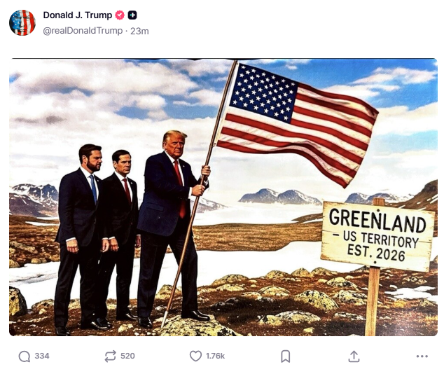 据新华社报道,美国总统特朗普20日凌晨在社交媒体上发布图片,他手拿美国国旗登上格陵兰岛,身后站着美国副总统万斯和国务卿鲁比奥,旁边指示牌上写着“格陵兰岛2026年成为美国领土”。