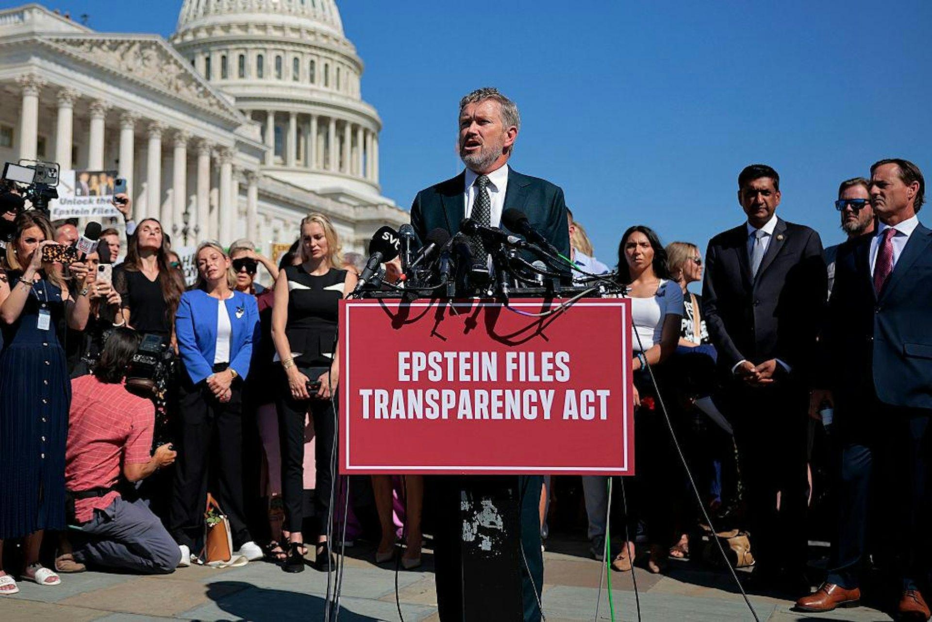 2025年9月3日,美国华盛顿,肯塔基州共和党众议员马西(Thomas Massie,中)在国会大楼外与曾遭爱泼斯坦性侵的受害者举行新闻发布会并发表讲话。(Getty)