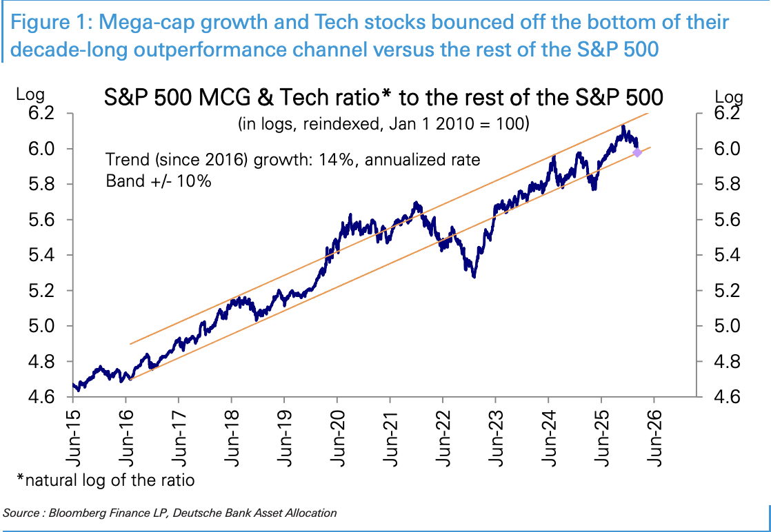 大型成长股与科技股相对于标普500指数其余部分的表现,从10月下旬位于其十年超额收益通道的顶部,一路跌至周四收盘时的底部,随后在周五反弹。