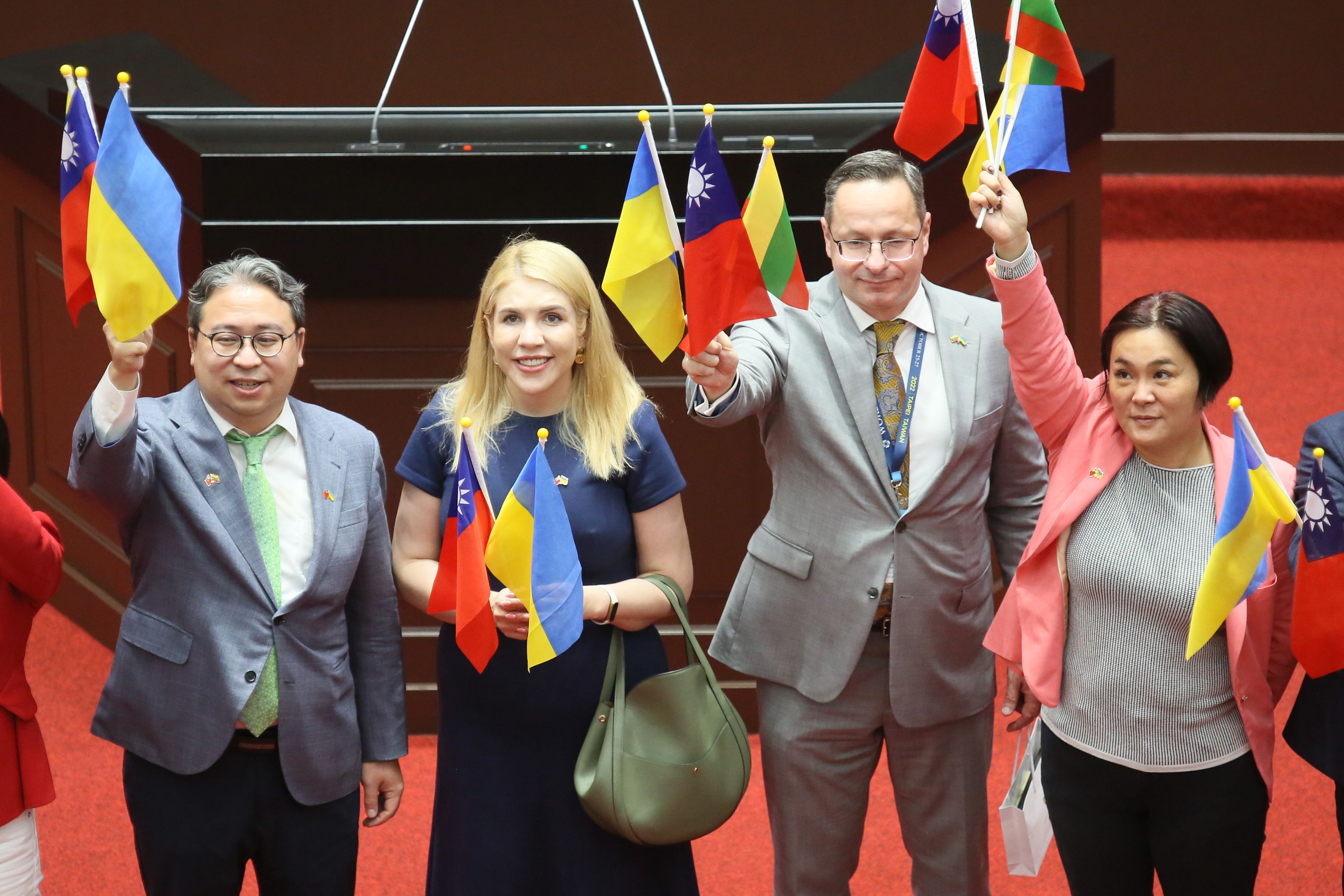 二0二二年,乌克兰国会议员卢狄克(Kira Rudik)(左二)及立陶宛欧洲事务委会副主席帕季格(Zygimantas Pavilionis)(右二)一行参访立法院。(柯承惠摄)
