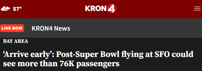 美国运输安全管理局(TSA)呼吁在超级碗比赛结束后第二天离开旧金山湾区的球迷,“像胜利者一样乘坐飞机,并做好接受安检的准备”。