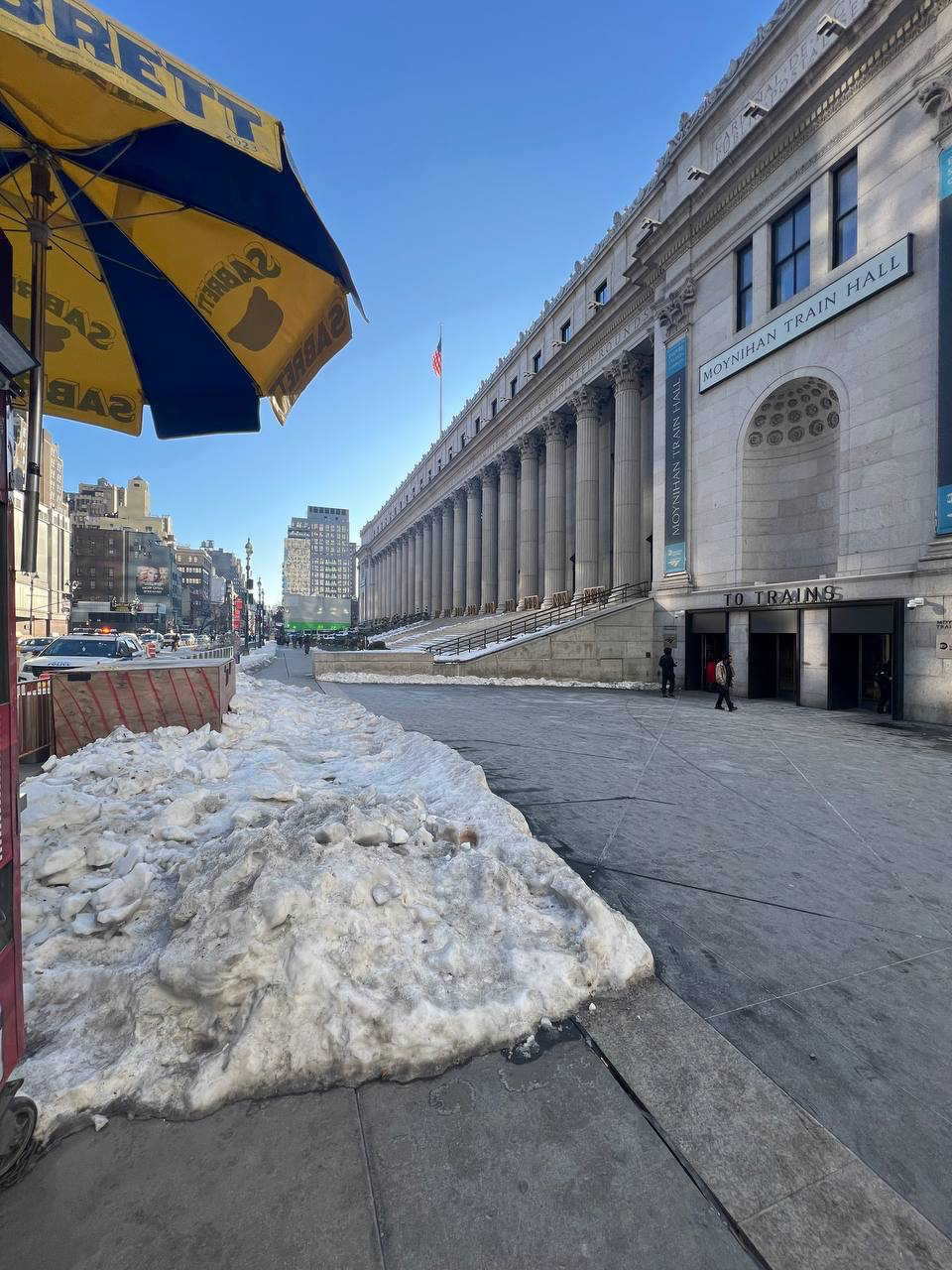 搭乘火车前往曼哈顿的华人观光客张先生表示,8日的风力其实已有所减小、冷感不如前一日那样强烈,但曼哈顿街头依旧如「末日」般冷清,平日人流拥挤的宾州车站(Penn Station)周边几乎不见行人,让他隐约想到了新冠疫情刚刚爆发时的样子。