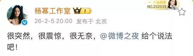 当晚8点,杨幂工作室率先打破沉默,以“很突然,很震惊,很无奈”九字发文,直接@微博之夜官方要求给出说法,该微博一小时内点赞量狂飙145万,粉丝纷纷声援“姐姐无辜背锅”。
