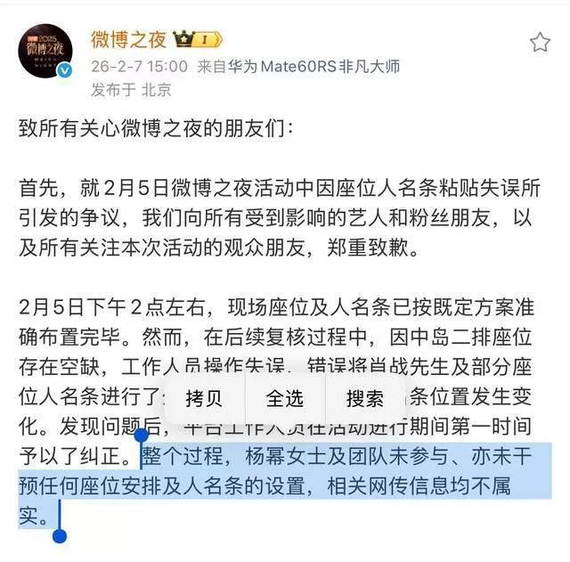 2月7日,主办方发布第二份正式声明,在重复“操作失误”论调的同时,强调杨幂及其团队未干预座位安排,澄清“抢C位”传言不实,并承诺强化细节管控。但这份看似态度诚恳的声明,实则暗藏诸多逻辑硬伤,未能回应舆论最关心的三大核心问题。