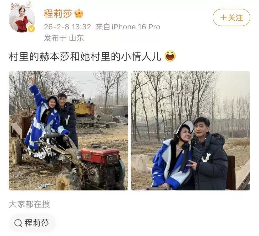 郭晓东和程莉莎夫妇都在社交账号晒出在老家农村过年的状态。