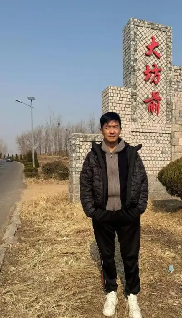 每次回家,郭晓东都习惯在“大坊村”标志前合影留念。这一习惯已持续多年,成为他与家乡的情感仪式。