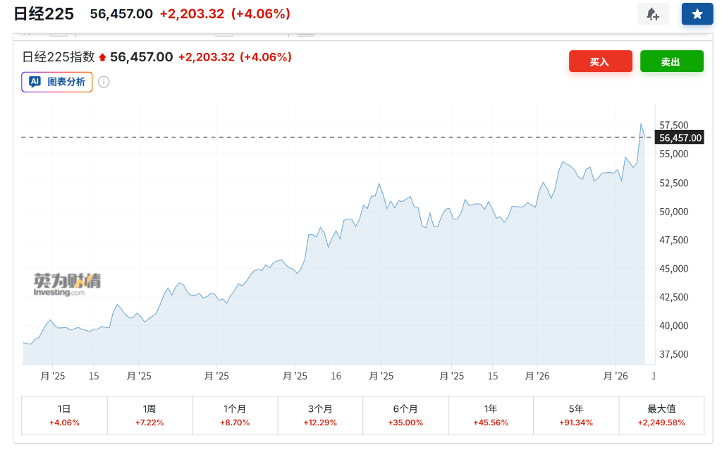 周一,日本股市在选举结果公布后飙升至历史新高,日经225指数盘中一度大涨5.7%,突破57,000点大关。与此同时,日元和日本国债市场的表现比许多分析师预期的更为冷静,未出现此前因担忧财政可持续性而引发的剧烈波动。这种“股汇双升”的局面显示,市场正将此次选举结果解读为政治不确定性的消除,而非立即开启无序支出的信号。