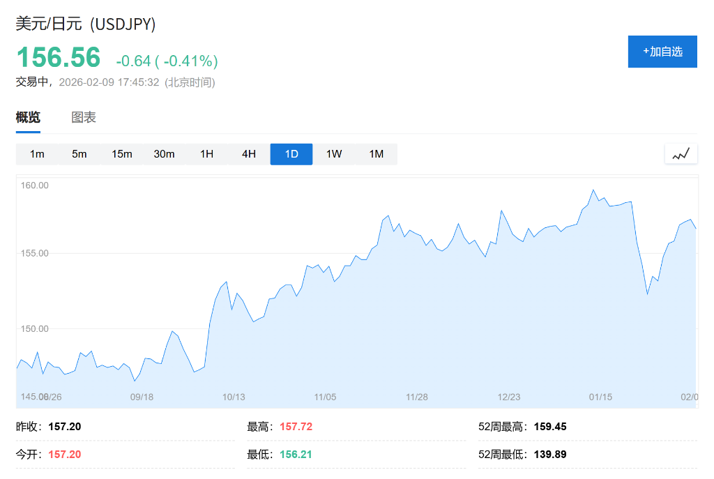 与通常预示日元走弱的“高市交易”不同,周一日元兑美元汇率不跌反涨,一度上涨0.6%至156.22,进一步远离了此前引发日本当局干预的160关口。